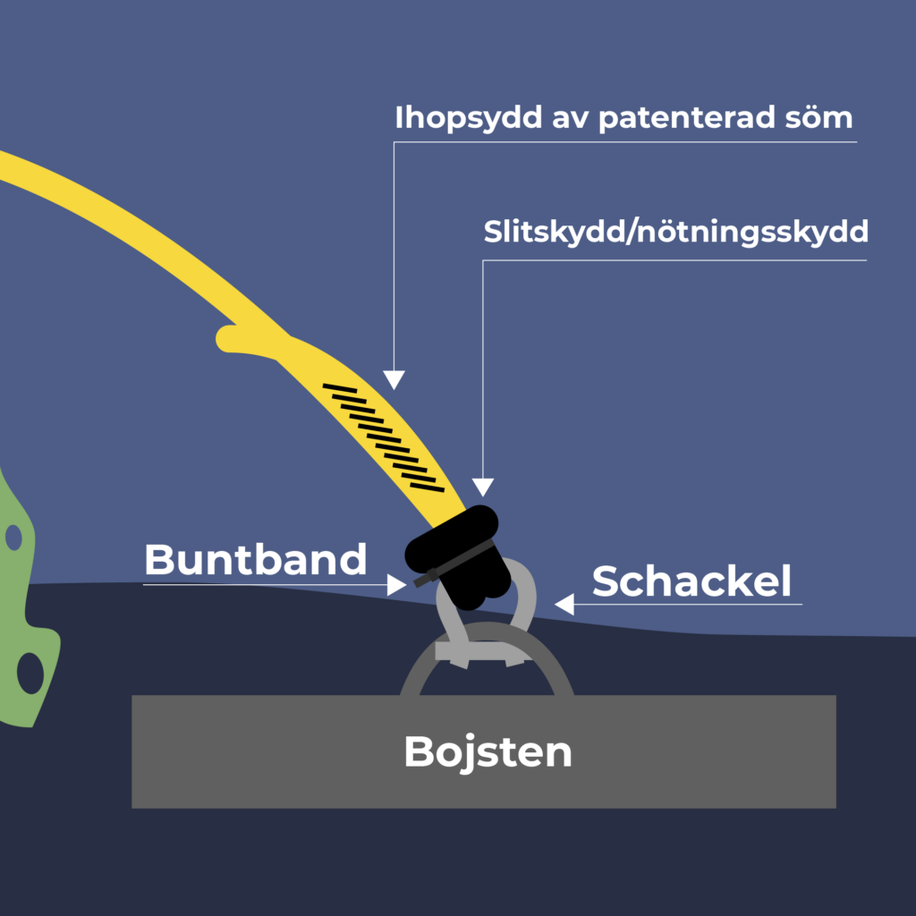 Att montera bojlinan är mycket enkelt med hjälp av två medföljande schacklar i varje ände. Ändarna av bojlinan som löper genom schacklarna är utrustade med slitskydd, vilket skyddar linan mot nötning och ger O-boj en lång livslängd. Den patenterade sömmen mellan de två linorna, likt den du hittar på vår populära Storm X gör O-boj mycket slitstark och stryktålig.