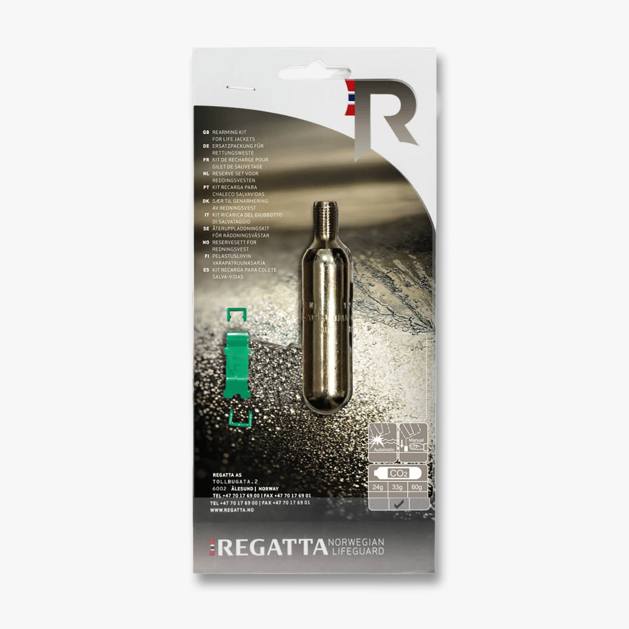 Gaspatrone für die Junior-Modelle der aufblasbaren Schwimmwesten von Regatta: Aquasafe Junior und Childsafe. Im Lieferumfang sind Clips enthalten, um die Auslöseschnur von HR (Halkey Roberts) und UM (United Moulders) zu sichern.